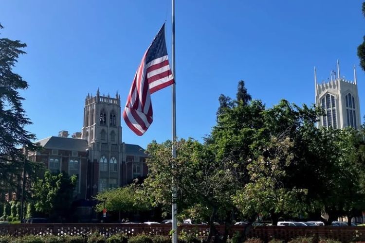 Beautiful conversations across our three University of the Pacific campuses as friends and colleagues remember former President Don DeRosa. Campus flags are flown at half-staff while our Student Life team honors our 23rd president at the Don and Karen DeRosa University Center. #RIP #PacificProud