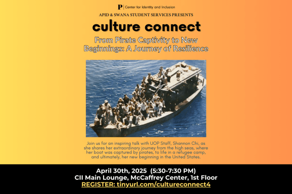 Culture Connect is a monthly in-person, learning & community-building series dedicated to learning about AAPI & SWANA stories, experiences, histories, and context as it relates to belonging, identity, empowerment, and social justice. Join us for an inspiring talk with UOP Staff, Shannon Chi, as she shares her extraordinary journey from the high seas, where her boat was captured by pirates, to life in a refugee camp, and ultimately, her new beginning in the United States.