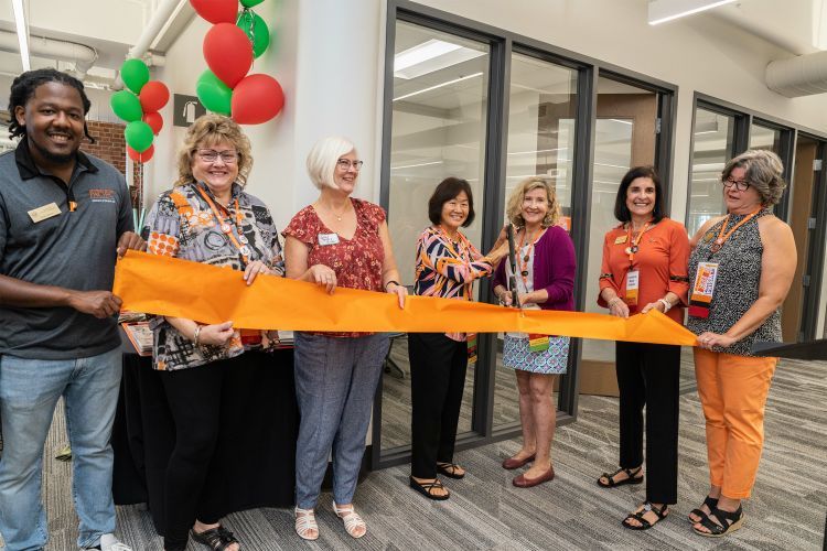 Karen Nakamura (center), Francesca DeMello (second from right) and LaNor Smith (far right) at the naming of the Alpha Chi Omega Study Room during Homecoming and Family Weekend in 2022.