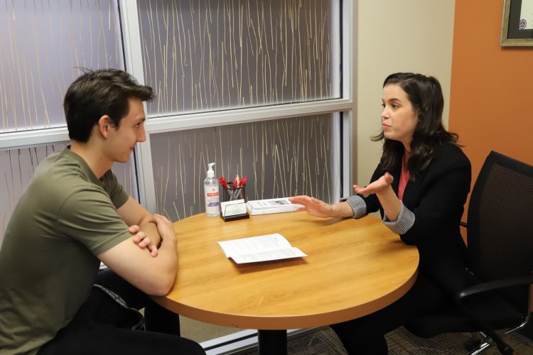 Bailey Gutierrez advises a student inside Career Services, located on the second floor of McCaffrey Center.