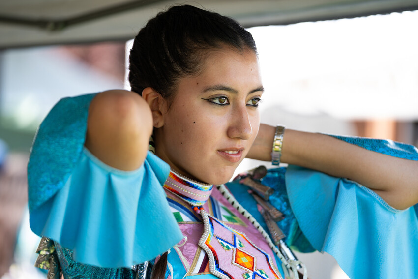 A dancer prepares to perform during the annual Labor Day Pow Wow held at Pacific.